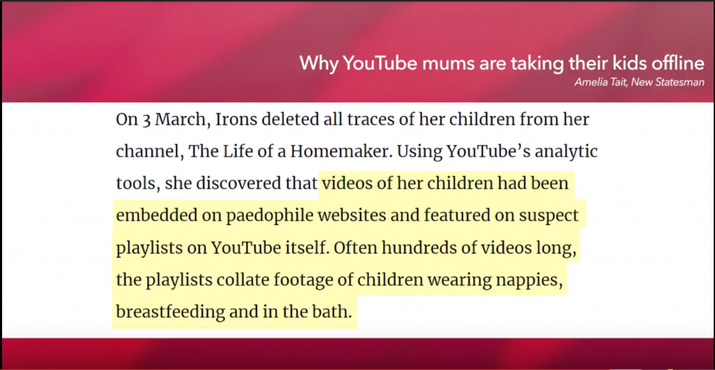 I always look up the crimes that were committed in areas before I move there for my own safety. When I was pregnant, I decided to look up the sex offender registry in areas where we wanted to move. Here’s the thing, I can control where we want to move. I can’t control what happens with the photos and videos that are posted on social media. Amelia Tait, a freelance writer with the New Statesman, wrote a revealing article about how easy it is for pedophiles now. Mommy Vlogger Allison Irons checked her analytics and realized that her children’s videos were embedded on pedophilia websites. She no longer has a YouTube account now. What about all of the images that are saved and can’t be tracked with analytics tools?