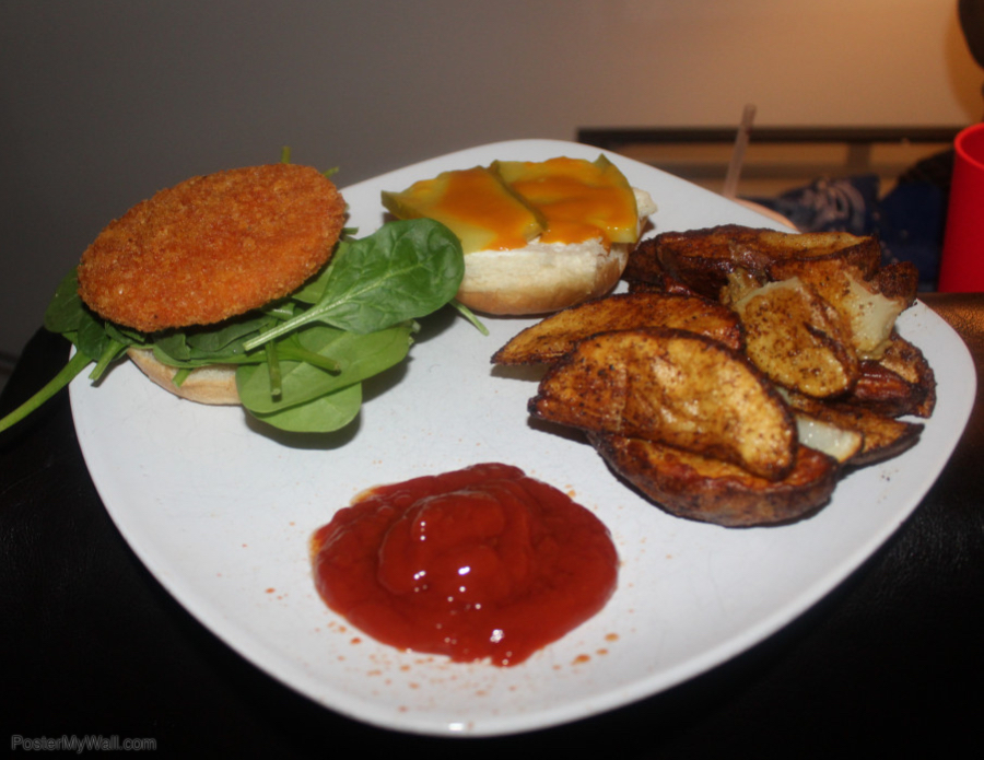 So, I have made this chick’n sandwich quite a few times and it is so good Y’all! My fiance decided to add a kosher pickle slice to his sandwich, so I did the same. Anyway, the meat patty is the Buffalo Crispy Chick’n patty by Gardein. On the sandwich, I put a pickle, honey gold sauce and raw spinach then served it with deep fried wedge fries.