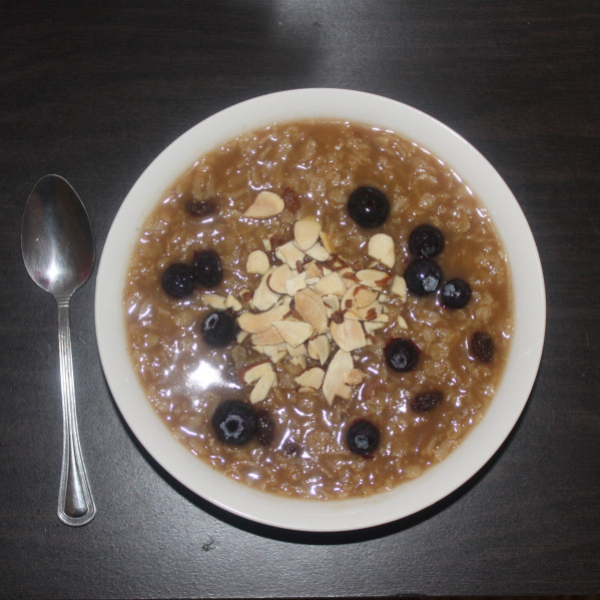 I do not like dry oatmeal. I prepare the oatmeal slightly to the directions on the container. I used to use quick oats or instant oats, but opted to use old-fashioned oats instead. I use Almond Milk in place of the water. My mother used to make my oatmeal with milk and it was always better that way. I add brown sugar, cinnamon, and raisins to it, then top it with sliced almonds and frozen blueberries.