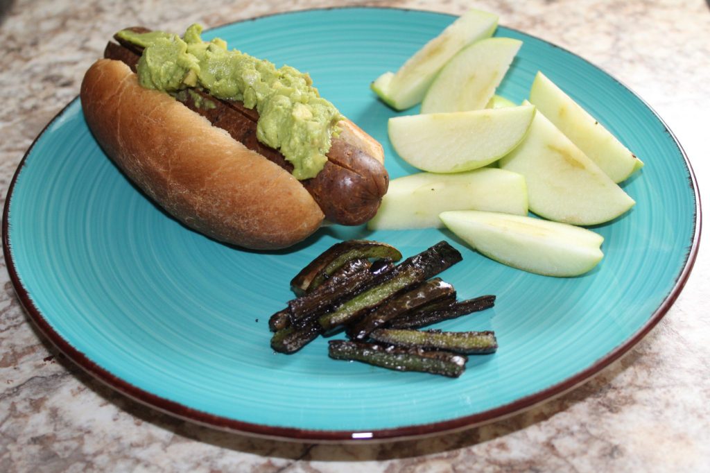 This isn’t a hot dog, I know. We put a plant based sausage onto the hot dog bun instead because they are filling. I sliced the sausage down the middle and put it into the oven for about 8 minutes in a cast iron skillet. After they were done, I added guacamole to the top of the sausage dog. The weird looking green slices are the fried half of a bell pepper seasoned with salt, pepper, and red pepper flakes. I ended up putting them on top of the guacamole. Then, served it with slices of green apple. I was still hungry, so I had a handful of BBQ Chips πŸ™‚