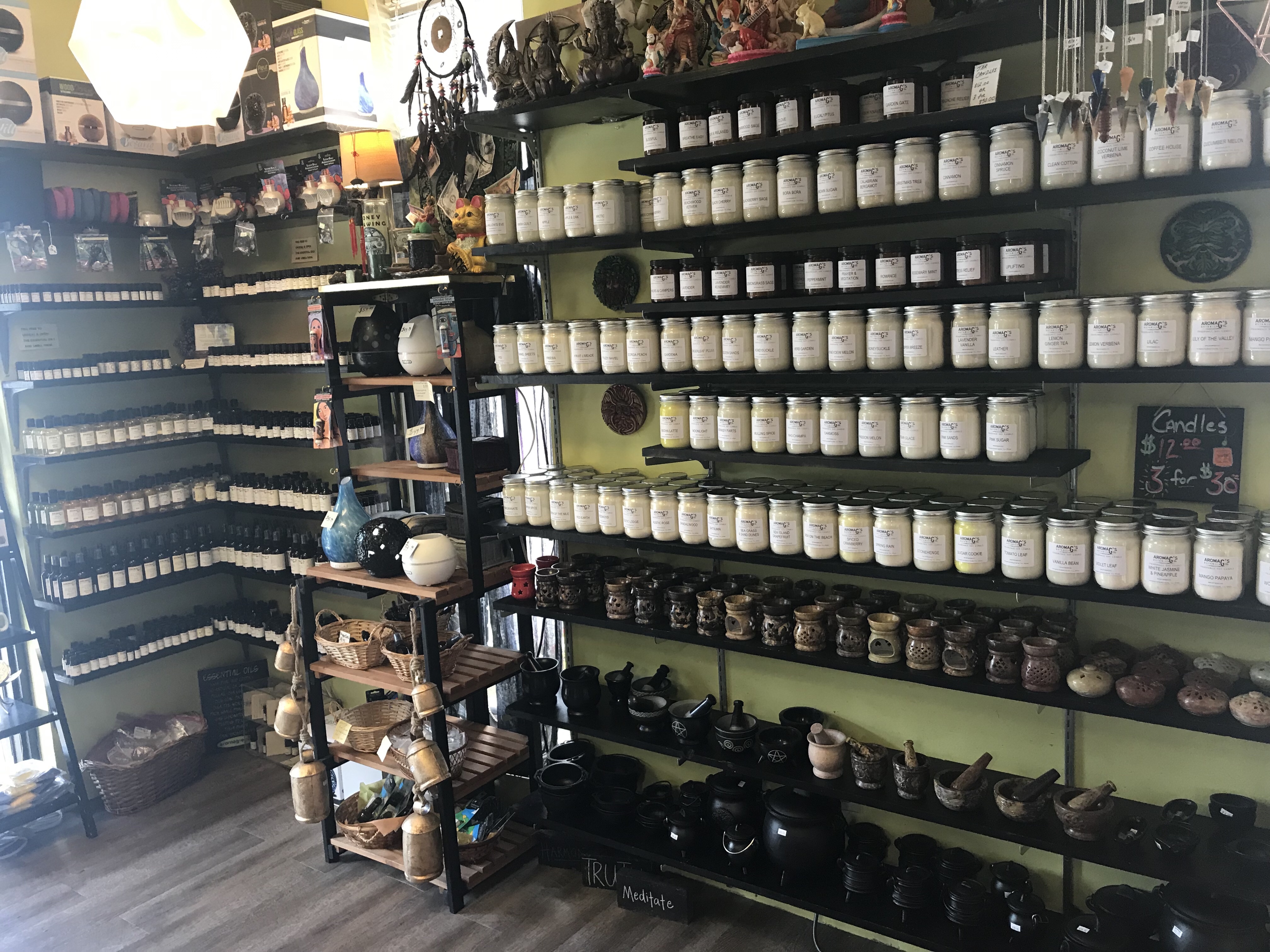 On the same wall as the essential oils, are the candles and mortar and pestles.